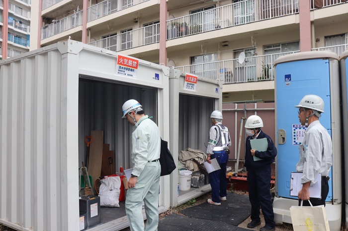 このうち市営住宅の改修工事の現場では、は6-10棟(WRC造地上5階建て、延べ床面積1670・48平方㍍)と6-11棟(同1759・28平方㍍)の2棟の外壁・防水・塗装改修に加え、集会所(RC造平屋建て、延べ床面積150平方㍍)の外壁・防水・内部改修、外構工事を実施しています。