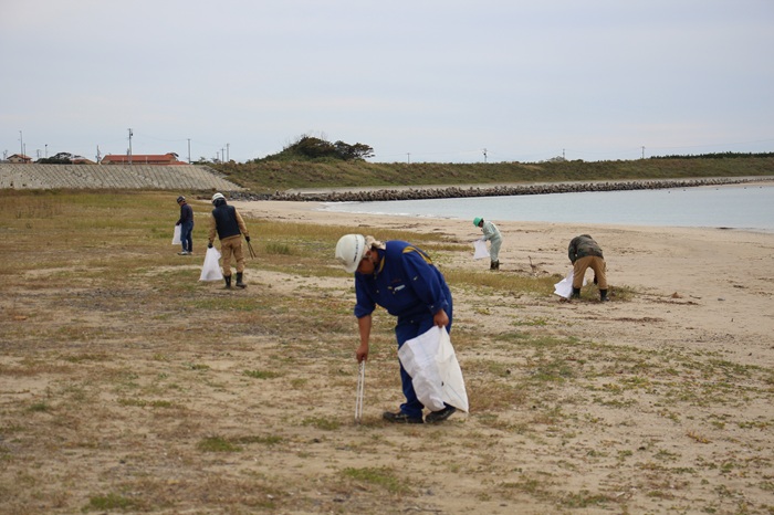 県北支部と東部沿岸支部から30人が参加し、気仙沼市の大谷海岸の砂浜約500メートルで、たばこの吸い殻やプラスチックなどのごみ拾いを行いました。